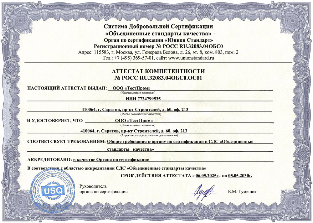Орган по сертификации ТЕСТПРОМ в СДС «Объединенные стандарты качества» имеет право выполнять сертификацию производства, работ услуг по следующим объектам сертификации:
