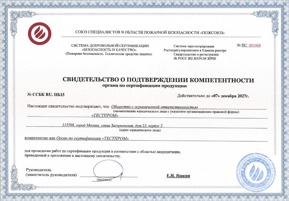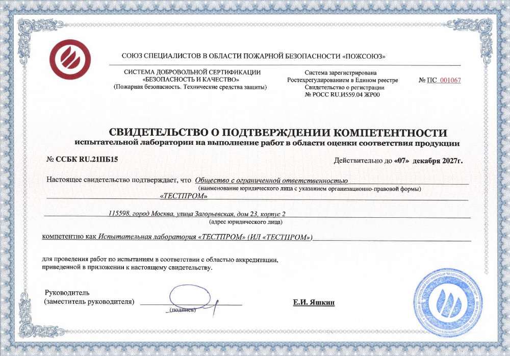 Орган пожарной сертификации «ТЕСТПРОМ» имеет возможность в проведении сертификации и испытаний на соответствие пожарным нормам по следующей продукции: